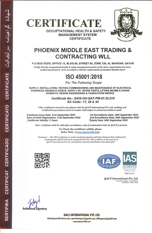 Phoenix Middle East Qatar is a service installation testing & commissioning, design supplying monorails, runway beams- Overhead cranes, Gantry cranes, Jib Cranes, Monorail hoists, and freestanding superstructures- in Qatar.